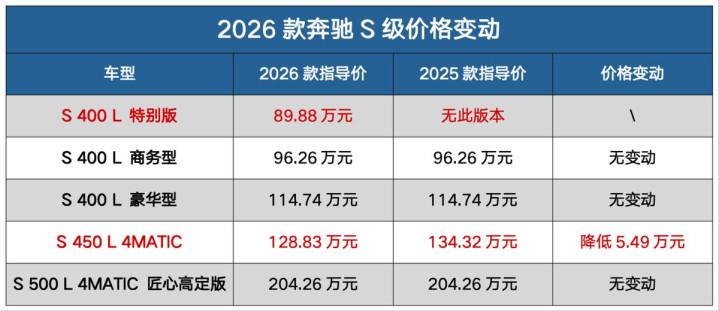 当然了,我们本篇文章重点聊的并非尊界S800,而是前两天刚刚上市的2026款奔驰S级,它的定价非常有意思,这次,它推出了一款S 400 L 特别版车型,售价89.88万元,相当于拉低了奔驰S级的起售价,要知道,老款车型的起售价为96.26万元,而2026款的起售价则来到了89.88万元,起售价降低了6.38万元。